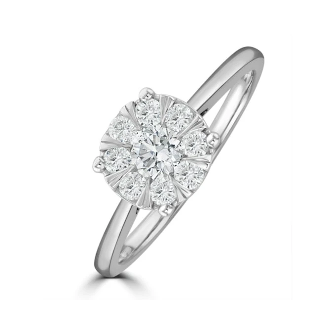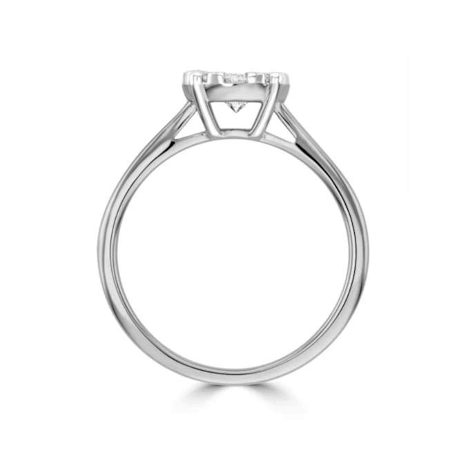 Imagine your loved one’s eyes light up when you present her with this breathtaking diamond ring. It showcases dazzling lab grown H/Si diamonds, intricately set in a cluster design for maximum light reflection and sparkle. The stones look beautiful, set in the polished white gold band.