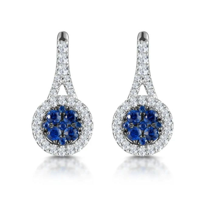 An exquisite pair of sapphire earrings with a diamond halo design, this handcrafted piece is sure to impress. Each earring features a cluster of royal blue sapphires in the centre, as well as diamonds in a halo setting and along the stems, designed for maximum sparkle. The stunning finishing touch is provided by the fine 18K gold setting.