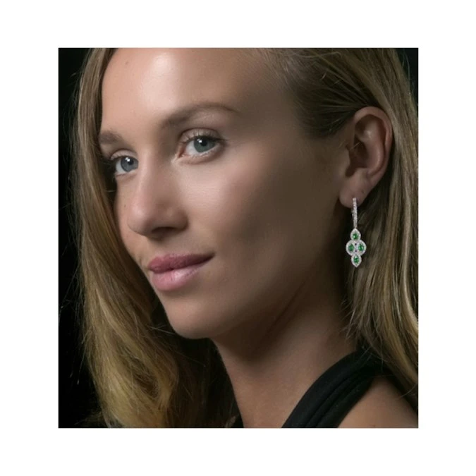 This enthralling pair of emerald and diamond chandelier earrings evoke extravagant luxury and sparkle. Their impressive halo design, handcrafted to showcase the emeralds’ vintage style marquise cut, is set in high quality 18K white gold. Perfect as a sumptuous gift for your most important occasions.