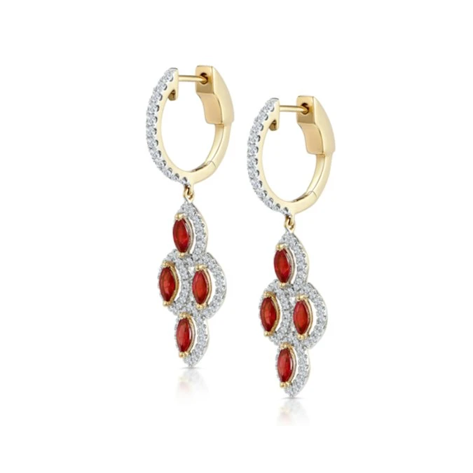 The beautiful design, with marquise cut rubies totally surrounded by dazzling diamonds, make these glamorous chandelier earrings truly show-stopping. Their substantial 18K gold setting means they will not only be a much loved piece of jewellery, but a real heirloom piece to be treasured for years to come.
