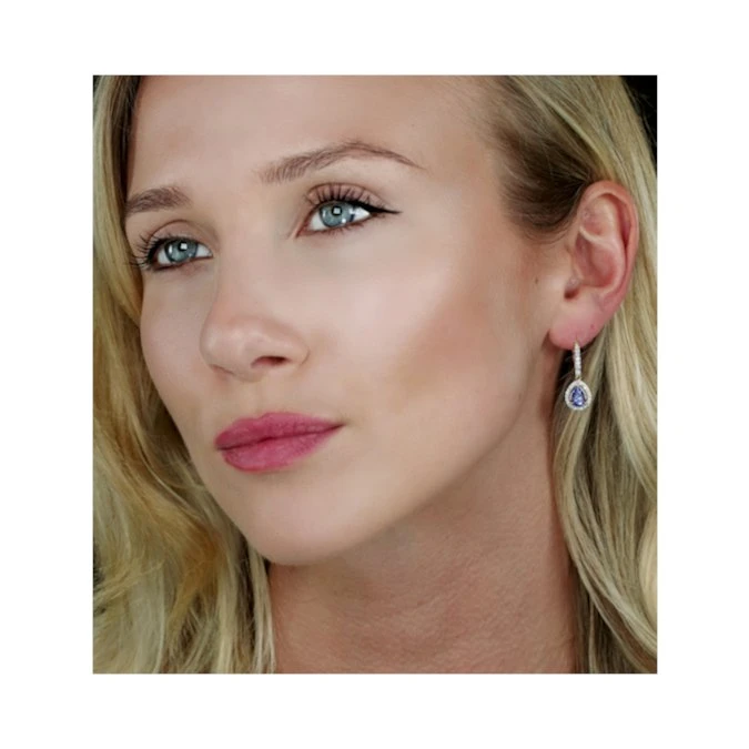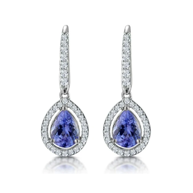 These tanzanite drop earrings are simply ravishing in their contemporary luxury design that shows off two pear shaped tanzanites surrounded by dazzling diamonds. Their elegance is beautifully offset by the finest UK hallmarked 18K white gold.