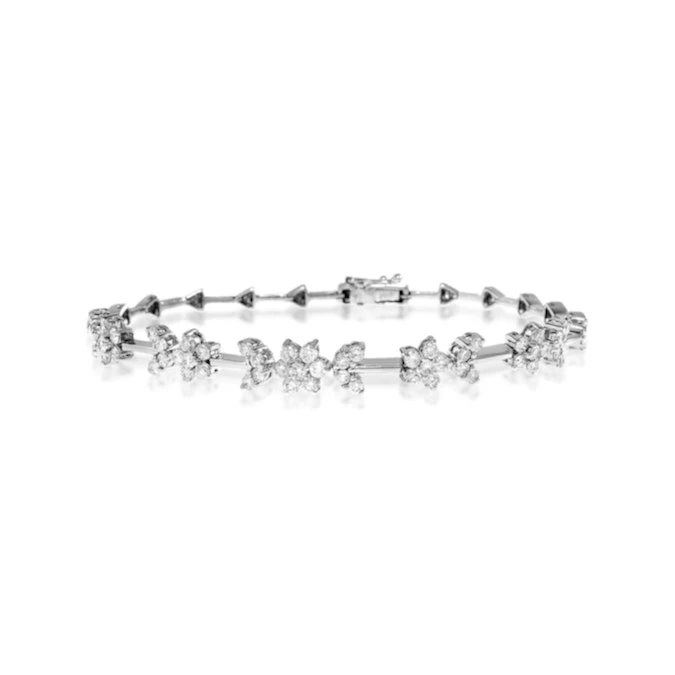 Beautifully handcrafted and featuring a unique floral diamond design, this bracelet is beyond par when it comes to formal evening elegance. Made with a staggering 2.20 carats of H/Si quality diamonds set in 18K white gold, it’s true heirloom piece.