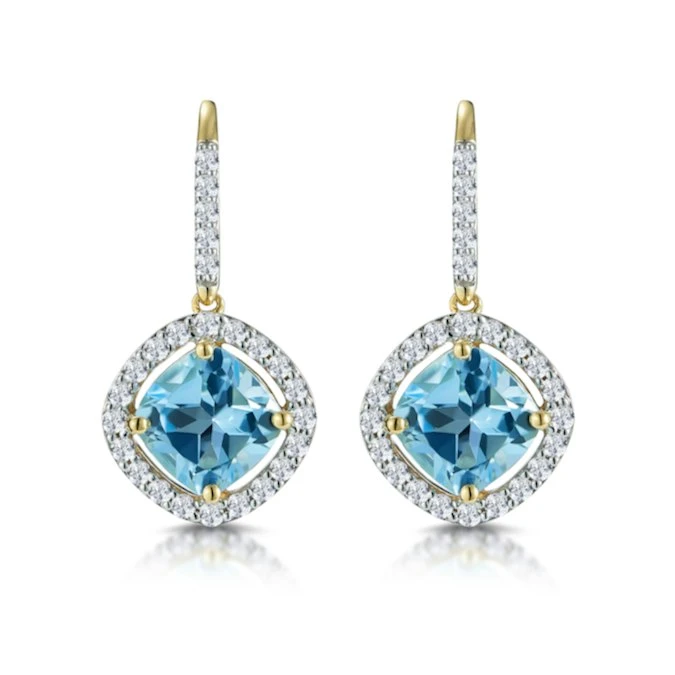 These blue topaz earrings are an truly enchanting piece of jewellery, a must-have for any jewellery collection. Set in 18K yellow gold and encircled with glittering H/SI conflict free diamonds to create a beautiful halo effect, this standout piece will make for an unforgettable gift.