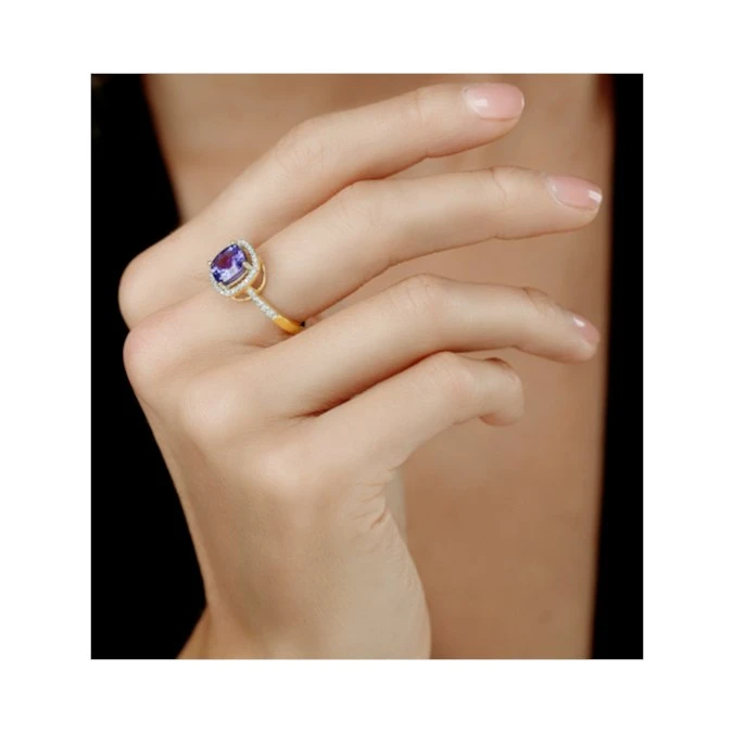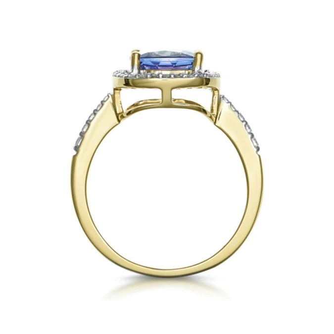 This glamorous statement ring features an exquisite, cushion cut tanzanite centre stone. Nothing short of heart-stopping, its blue and violet radiance is further enhanced by a beautiful diamond halo and sidestones on the band. Flawlessly presented in 18K gold, its sparkle, luxury and quality are unrivalled.