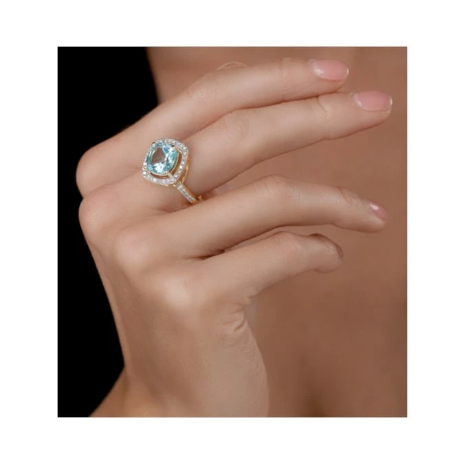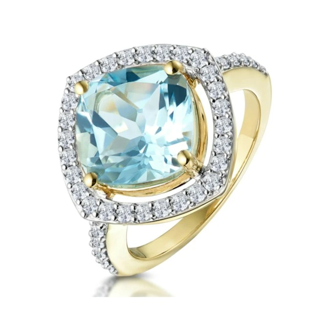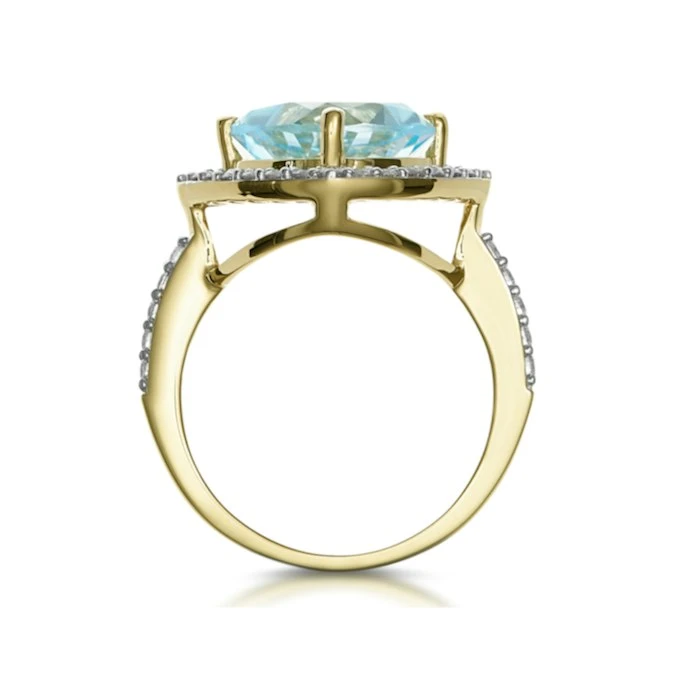 This gorgeous blue topaz and diamond ring is certain to make a stunning gift for a loved one or a beautiful statement piece for your own collection. Bold and beautiful in design, it makes for an eye catching conversation piece. The sky blue centre topaz is surrounded by sparkling H/Si quality diamonds and is beautifully finished in pristine 18K gold.