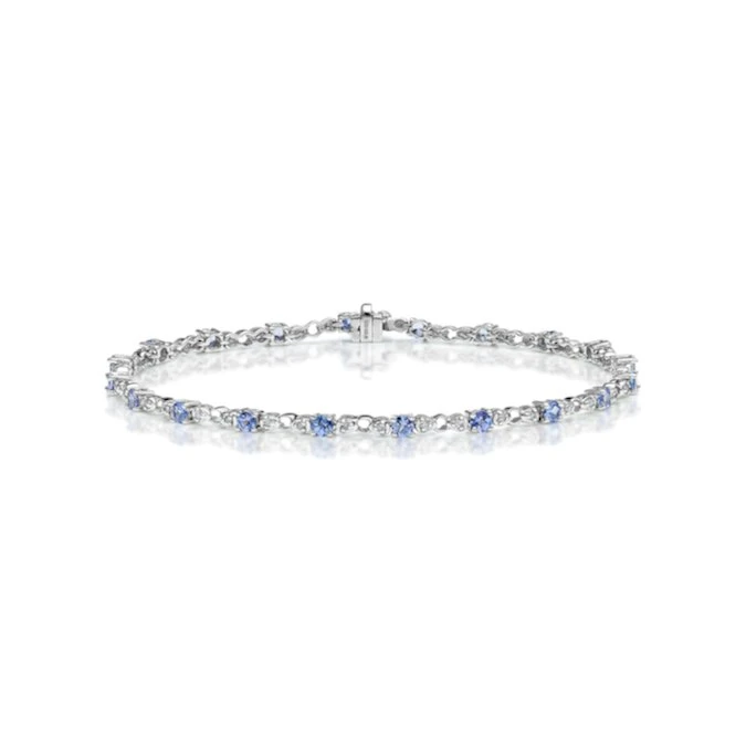 Pretty and delicate, this charming tanzanite bracelet would be a beautiful gift for a loved one celebrating a special occasion. The sophisticated deep blue of tanzanite combines beautifully with the crisp white diamonds to stunning effect. The bracelet features a collection of tanzanite gems weighing 1.45CT which are claw set and interspersed with glistening Premium Quality Diamonds and 9K white gold.