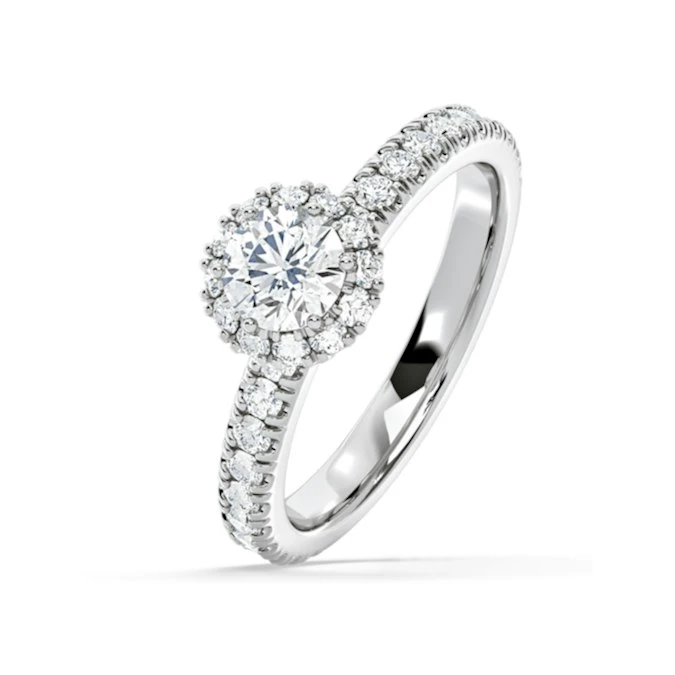 When you propose, she’ll cherish this luxurious 1.10CT lab grown diamond halo ring with its exquisitely handcrafted platinum setting encrusted with dazzling sidestones. The solitaire is quality certified at G/VS1 grade by IGI, one of the most esteemed gemmological grading experts in the world.