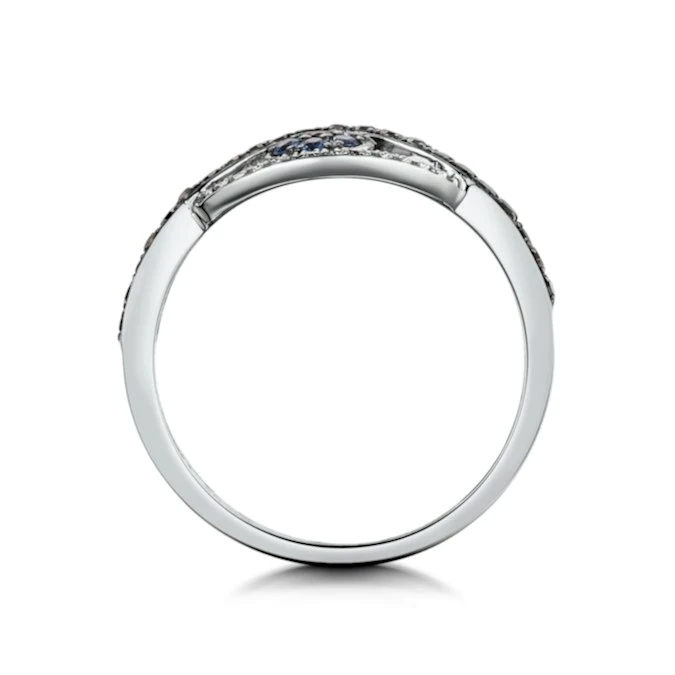 Keep the evil eye away with this brilliant blue sapphire and black diamond eye motif ring in 9K White Gold. The pave setting allows all of the stones to catch the light and sparkle. A trendsetting piece to add to your collection and cherish for life.