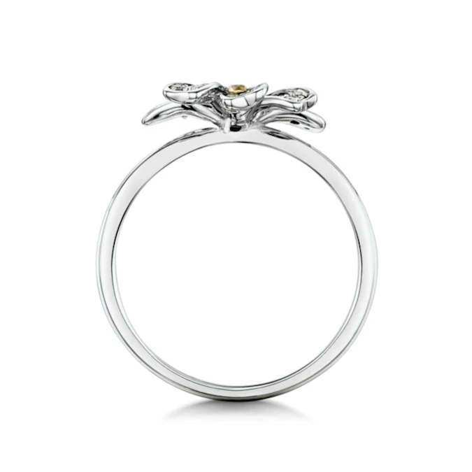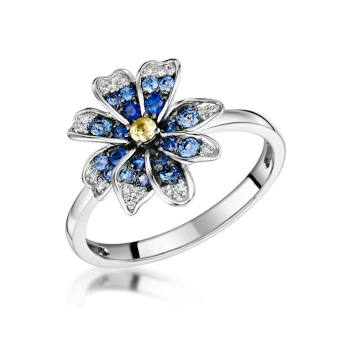 As extravagant as it is elegant, this blue and yellow sapphire ring features a breathtaking floral design set in white gold. Accentuated with sparkling diamonds on the petals, its beauty is simply breathtaking. This ring is sure to become a cherished part of your jewellery collection.