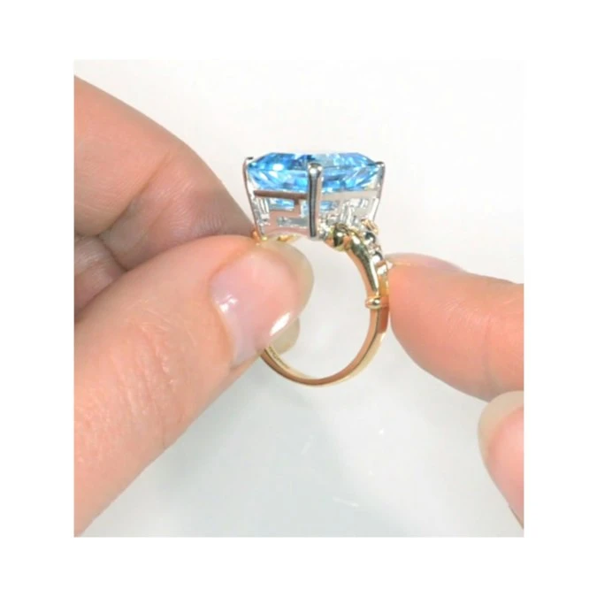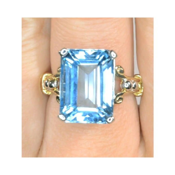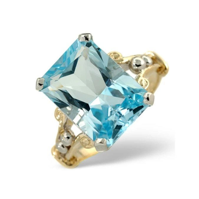 This breathtaking ring showcases blue topaz to stunning effect and would be the ideal gift for any lady who loves bold, statement jewellery. The ring features a staggering 9.35CT sky blue topaz which is emerald cut and measures 14x10mm. The stunning blue topaz gemstone is claw set within a glowing band of 9K yellow gold that adds the perfect finishing touch.