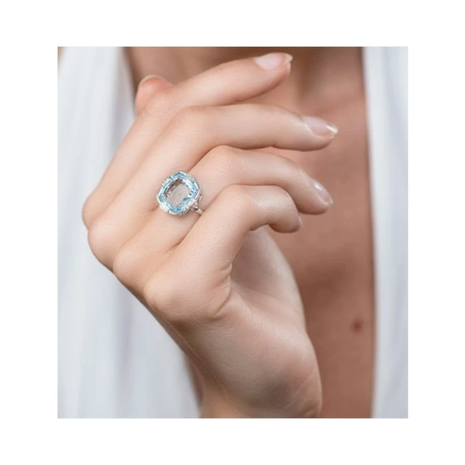 This large, translucent blue topaz has been handcrafted into a stunning statement ring. It’s held in a stylish contemporary white gold setting, adorned by premium diamonds for extra luxury and to bring out maximum sparkle. A beautiful accessory or gift ring to make you feel glamorous.