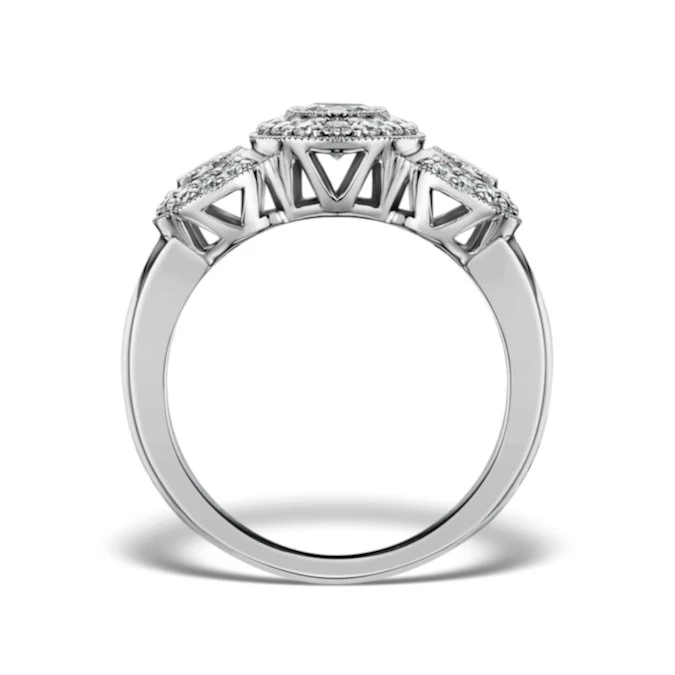 This exquisite trilogy ring is a contemporary take on the lavish jewellery of the Art Deco era. It showcases three sparkling lab grown solitaires, each framed by a dazzling diamond halo. Set in 18K white gold, it is a ring that will always make you look and feel luxurious.
