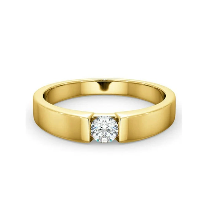 This modern ring showcases the simple elegance of diamonds to stunning effect. The spectacular Jessica yellow gold engagement ring features a 0.25CT H-I/I1 Quality Diamond which is held in a contemporary tension setting and nestled within a large band of 18K yellow gold.