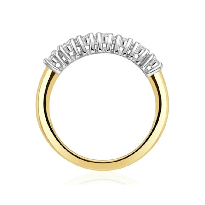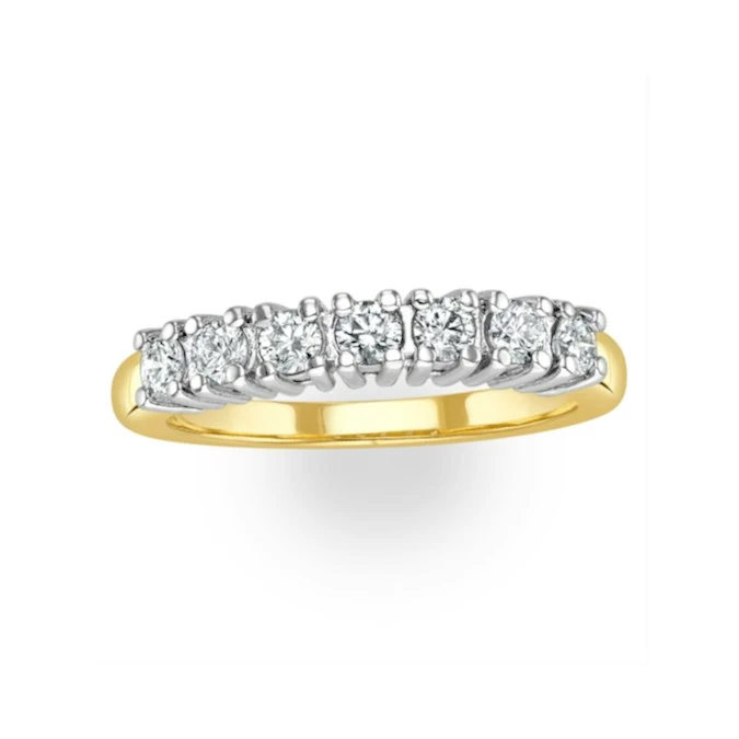 The beautiful seven stone diamond Chloe eternity ring is a timeless classic that will never go out of fashion. This stunning ring features seven round cut premium quality diamonds weighing a total of 0.30CT which sparkle brilliantly from their claw settings. The ring is finished with an 18K yellow gold band which provides a gorgeous contrast to the diamonds.