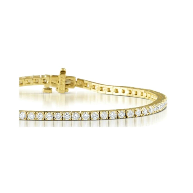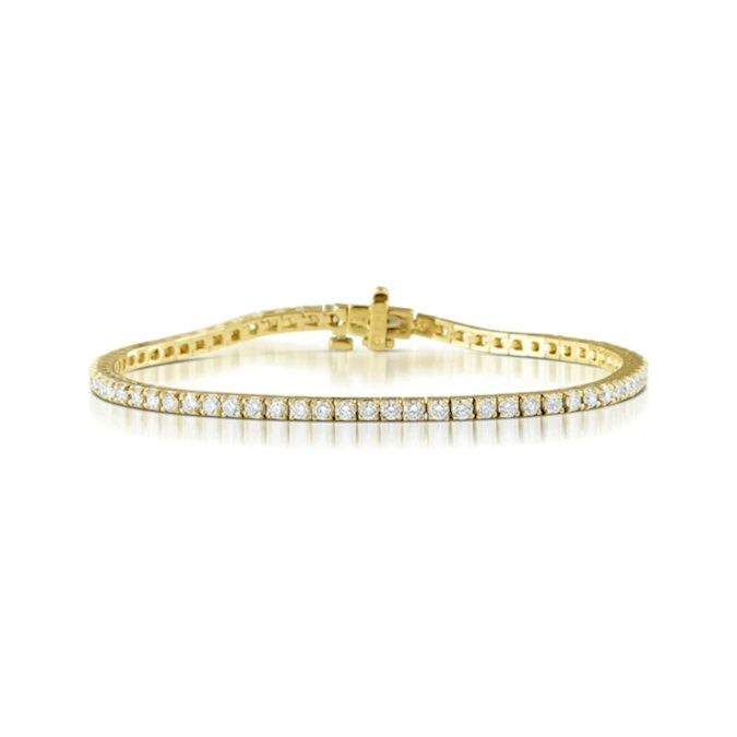 This diamond tennis bracelet is a truly stunning piece that makes a perfect gift for any special occasion. Made with sustainable lab grown diamonds, it offers breathtaking sparkle and beauty on the wrist. A luscious yellow gold setting completes the luxurious look.