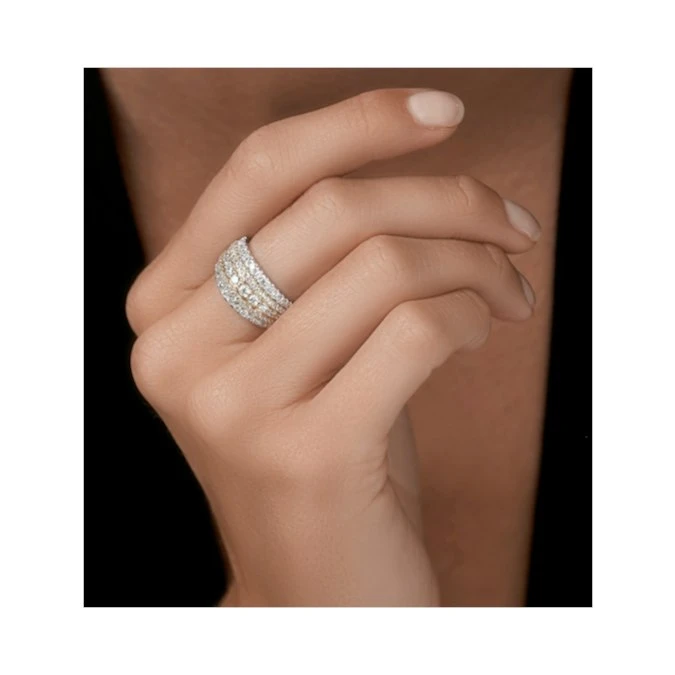 This beautiful eternity ring looks sensational with its five rows of diamonds handcrafted in two-tone gold. The stones are skillfully secured with a mixed claw and pave setting of 18K gold, enhancing the diamonds’ sparkle and creating a substantial feel that’s makes this piece into a true heirloom.