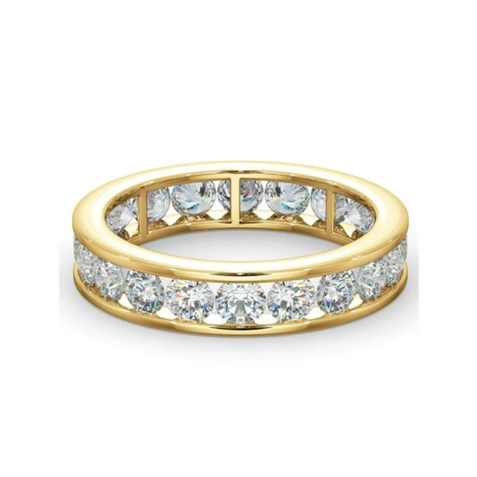 The 18K yellow gold channel setting of this beautiful Rae eternity ring securely holds an impressive 2.00CT of H/Si Quality Diamonds. As this is a full eternity ring, it means you will benefit from 360 degrees of shine from the pristine row of dazzling diamonds