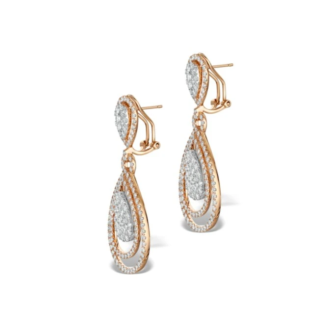 This enthralling pair of rose gold diamond drop earrings evoke extravagant luxury and elegance. Their impressive halo design is created with 18K rose gold and a breathtaking 6.66CT of H/Si quality diamonds. As true heirloom pieces, these earrings would make a sumptuous gift for your most important occasions.