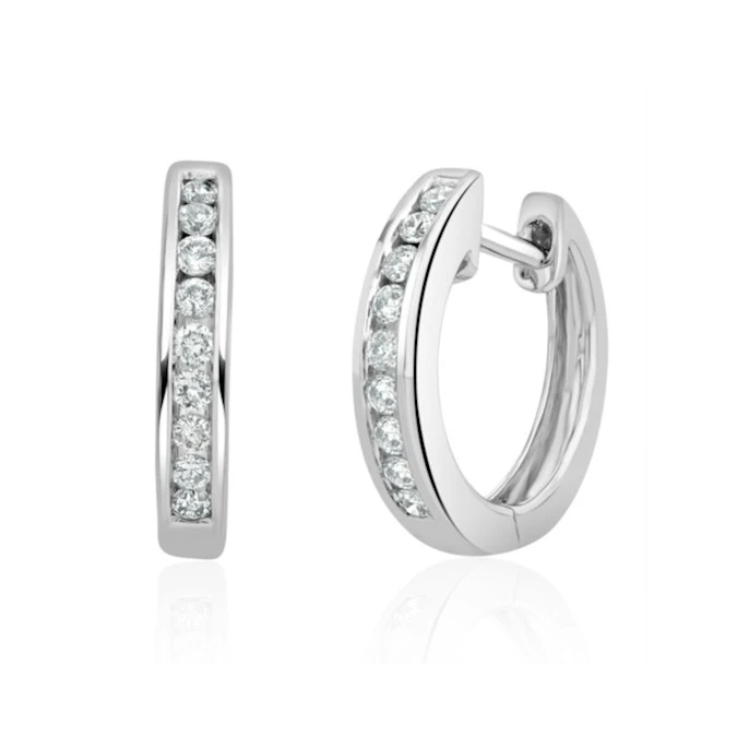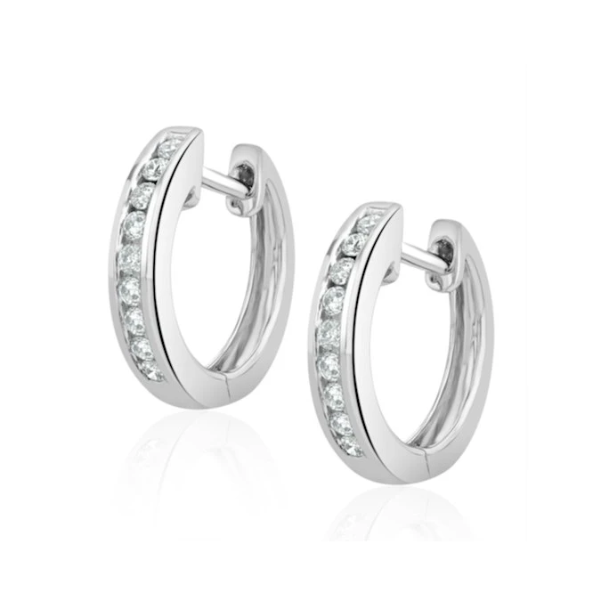 An exceptional pair of Diamond Hoop Earrings in 9K White Gold. Channel setting. 0.20CT of Premium Quality diamonds. Free UK delivery and a 5 year guarantee.