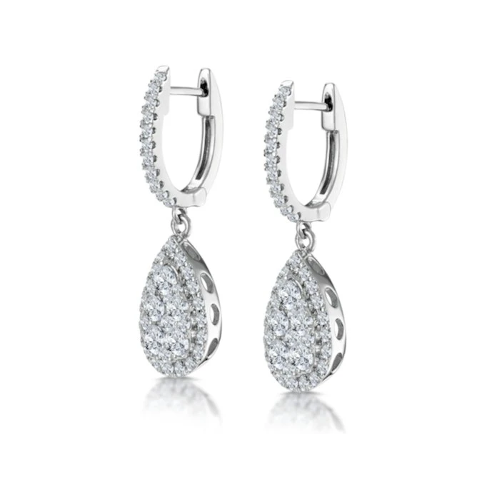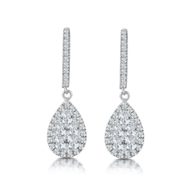 These dazzling diamond drop earrings echo the opulent glamour of vintage jewellery. They are exquisitely designed with H/Si quality diamonds in a mixed pave and claw setting of the finest 18K white gold. They create a look of elegant luxury, perfect for glam evenings and special occasions.