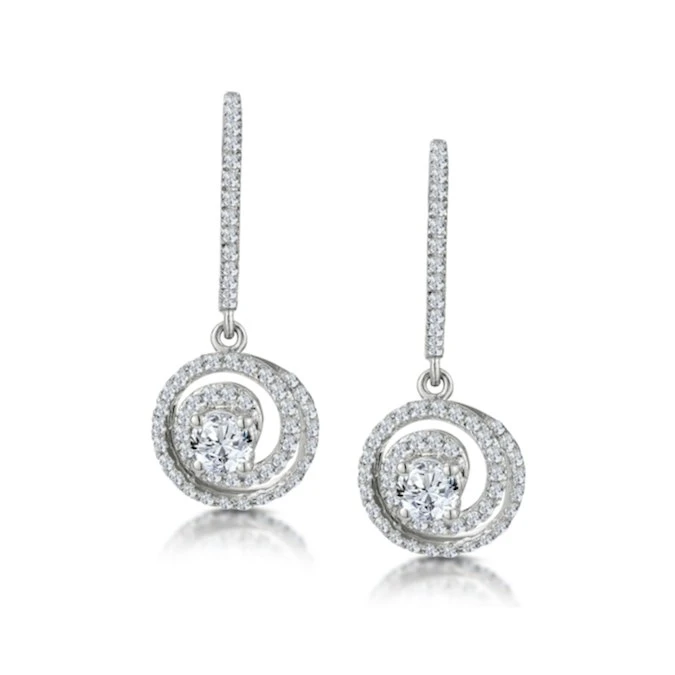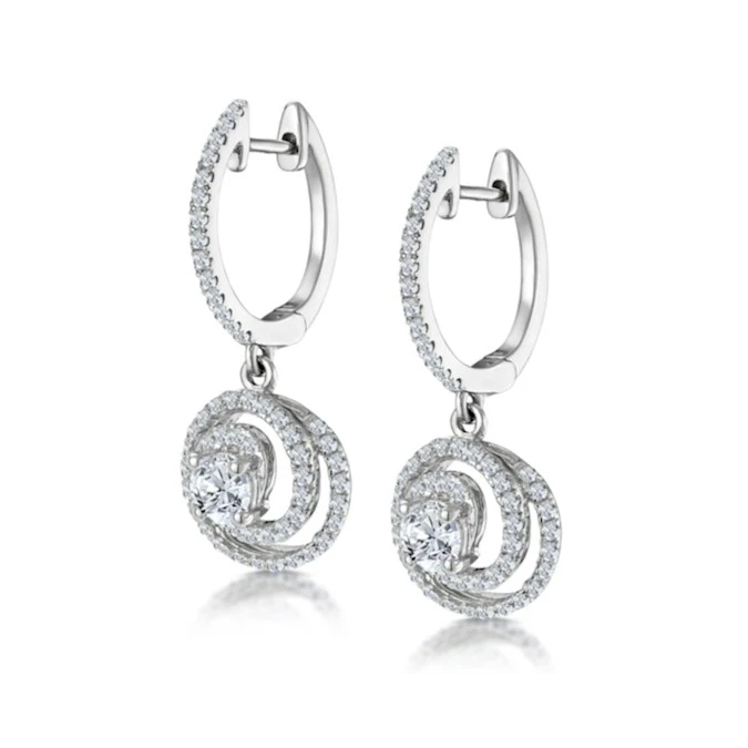 Create your ultra-elegant evening look with these exquisite diamond swirl drop earrings. Designed with a glittering spiral of H/Si quality diamonds to highlight your features, they’re set in the finest 18K white gold for a high quality feel. Diamond-studded secure clasps complete the opulent look.