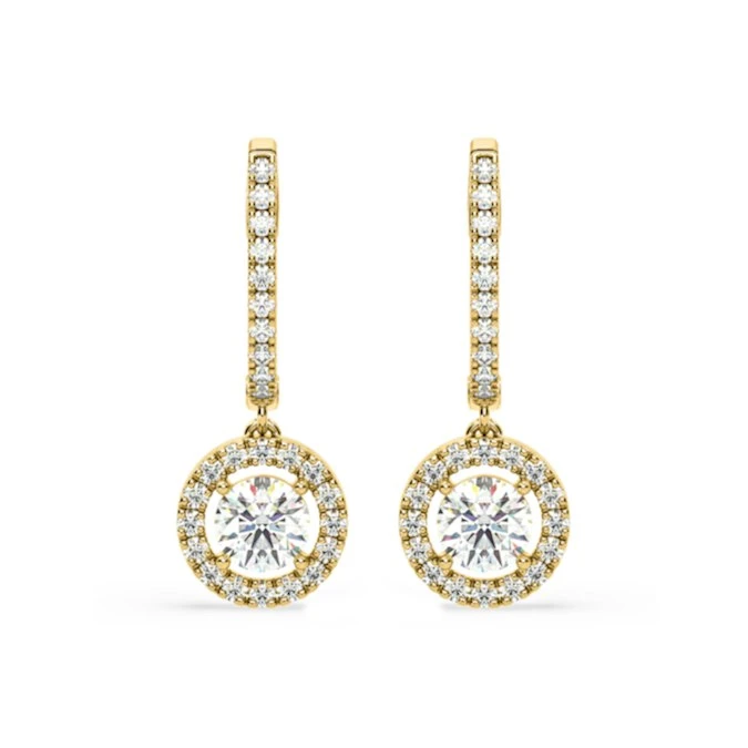 A beautiful certified pair of Diamond Drop Earrings in 18K Yellow Gold. Claw setting. 2.60CT of F/VS1 quality diamonds. Free UK delivery and a 5 year guarantee.