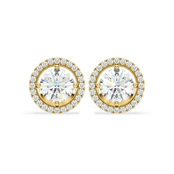 A special certified pair of Diamond Halo Earrings in 18K Yellow Gold. Claw setting. 2.45CT of F/VS1 quality diamonds. Free UK delivery and a 5 year guarantee.