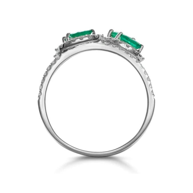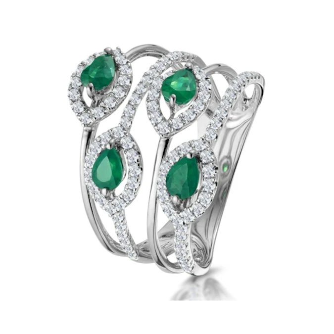 As extravagant as it is elegant, this four-band emerald statement ring showcases breathtaking detail. On each of its bands, it features a luscious, vivid green emerald and sparkling diamonds. Set in polished 18K white gold, it looks and feels gorgeous on the hand.