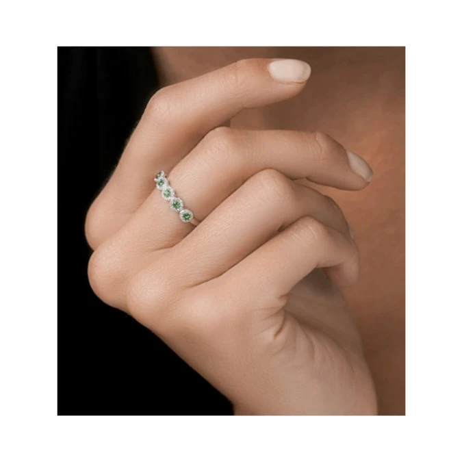 This unique and stunning emerald eternity ring has a contemporary design that looks stunning on the hand. Five vivid green emeralds, each surrounded by a dazzling diamonds halo, glitter beautifully in a setting of polished white gold. Perfect for adding a touch of luxury to any outfit.