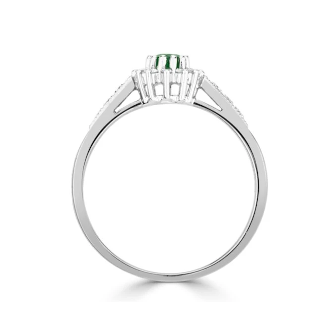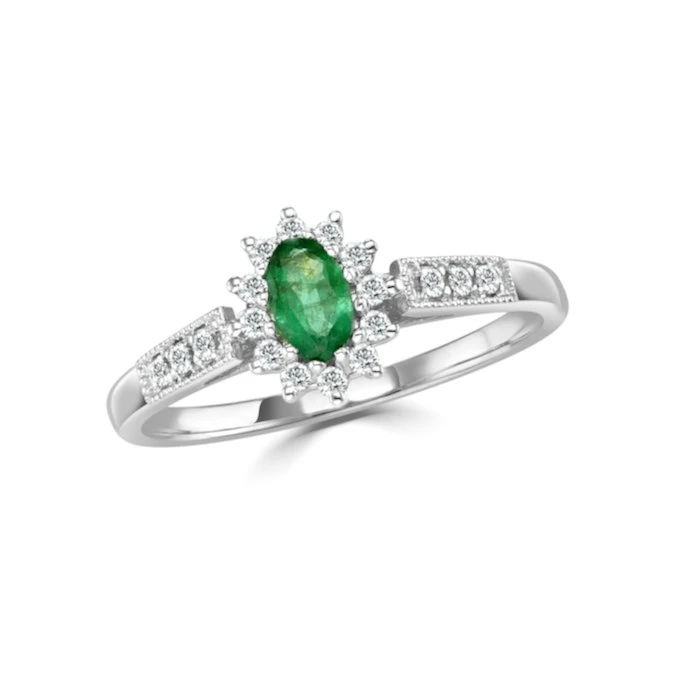 This alluring gemstone ring features a gorgeous green emerald which is encircled by environmentally sustainable lab grown diamonds. Set within a beautifully handcrafted sterling silver band, it’s a perfect luxury treat for any occasion.