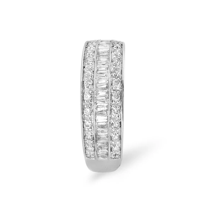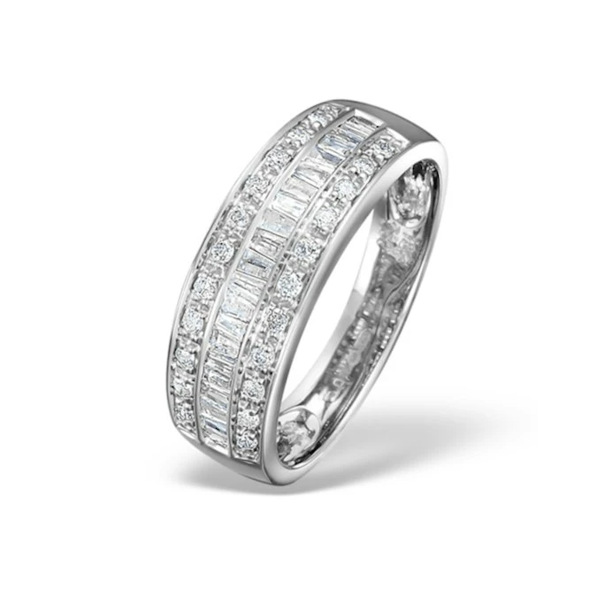 This ravishing half eternity ring with round and baguette cut diamonds is all about classic glamour. Set in beautifully polished white gold, the mixed diamond shapes emit long, elegant flashes of light for a perfectly luxurious effect. Ideal for an anniversary or a big landmark occasion, it’s a ring that’s made to be cherished for a lifetime.