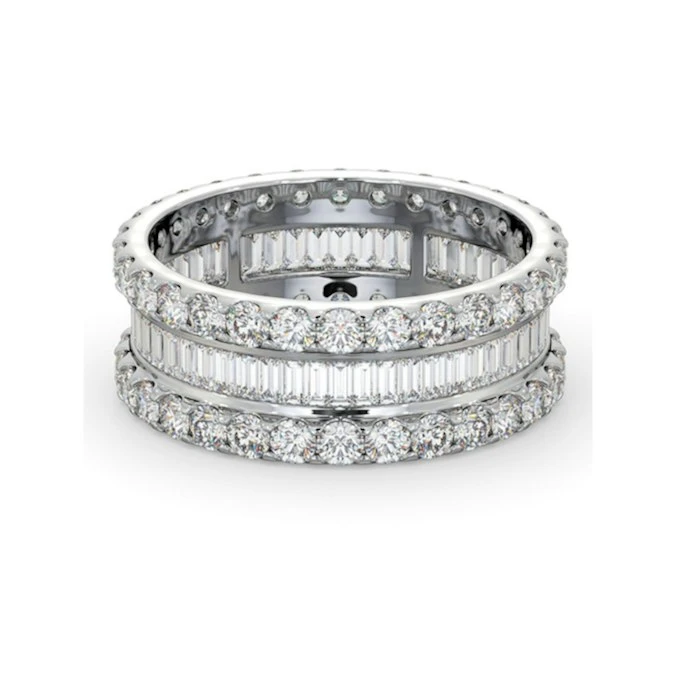 This stunning Katie eternity ring would be the ideal present for a special anniversary or occasion and is guaranteed to impress your loved one. The beauty of the 3.00CT of G/VS Quality Diamonds is showcased in a mix of baguette and round cuts to create intricate detailing which is perfectly complemented by the border of gleaming platinum. Take her breath away with this stunning eternity ring.