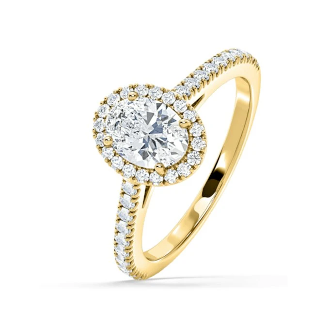 This magnificent halo engagement ring showcases a superb oval cut solitaire certified by GIA. Oval diamonds have a unique shape that lengthens the fingers and gives your hand an elegant look. The highly polished 18K gold band holds the setting securely and is also studded with diamonds for extra brilliance.