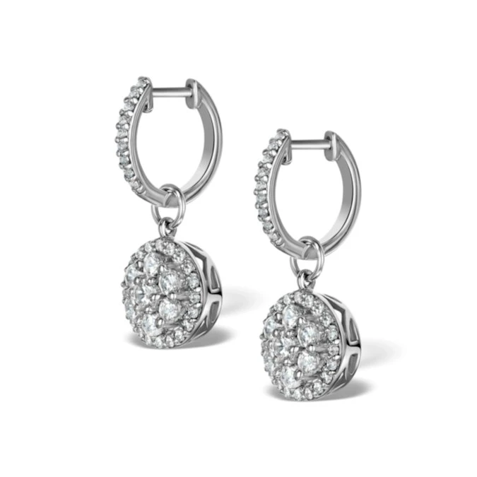 Create a look that’s glamorous and sophisticated when you show off these stunning diamond halo drop earrings. Designed with a cluster of six centre diamonds encircled by an exquisite diamond halo, they radiate with unmatched sparkle and fire. The 18K white gold setting is superbly polished with ornate detail behind the diamond drop, making the earrings look beautiful from every angle.