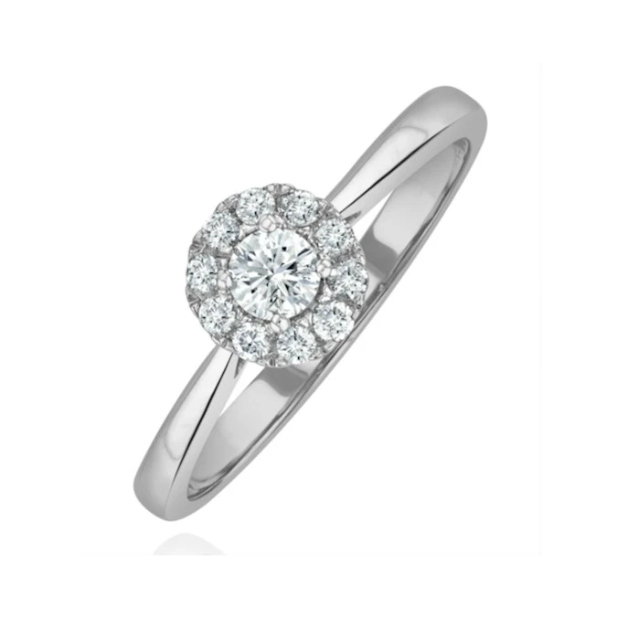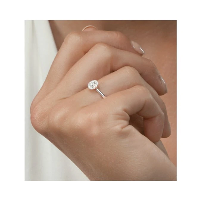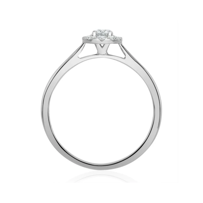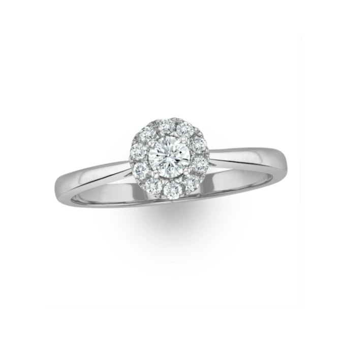 This stunning engagement ring is sure to get a ‘yes’. The ethical lab grown solitaire nestled within a radiant halo of smaller diamonds create beautiful sparkle, while the polished white gold band provides a flawless, luxurious look on the hand.