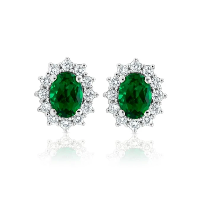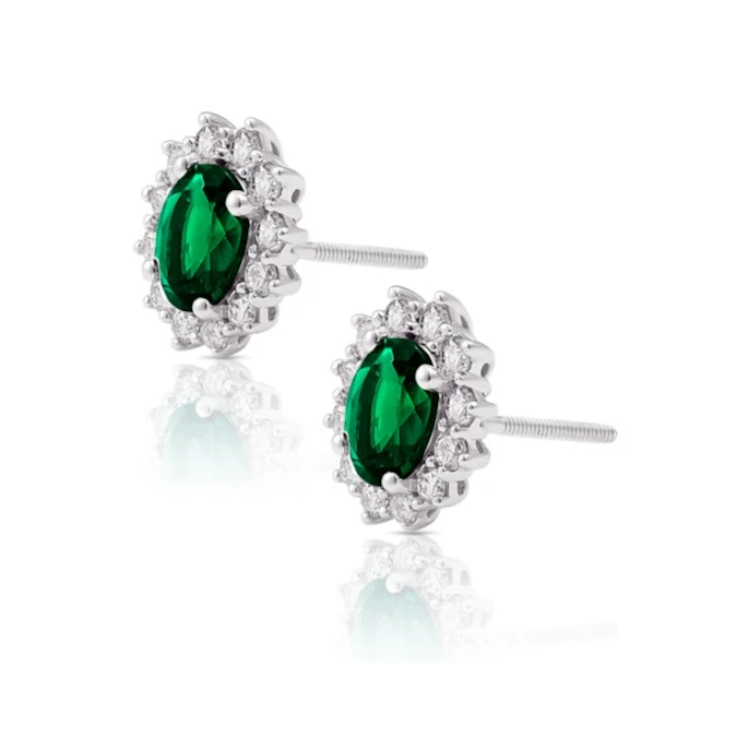A glamorous pair of Emerald Earrings in 18K White Gold. Claw setting. 0.50CT of H/SI quality diamonds. Free UK delivery and a 5 year guarantee.