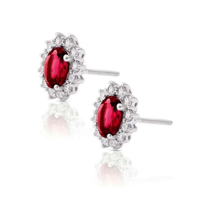A superb pair of Ruby Earrings in 18K White Gold. Claw setting. 0.50CT of H/SI quality diamonds. Free UK delivery and a 5 year guarantee.