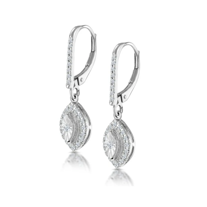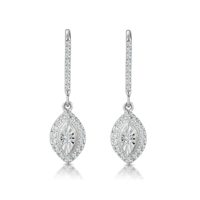 These magnificent drop earrings with their exquisite diamond detail are presented in white gold. They showcase a beautiful design that imitates the timeless look of a marquis cut diamond, perfect for any elegant event. The secure clasps are studded with even more diamonds for a truly luxurious finish.