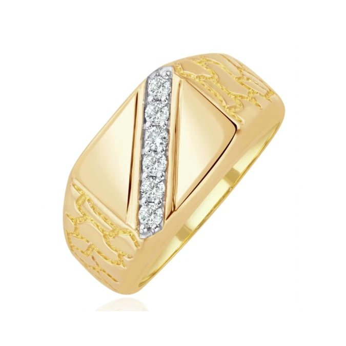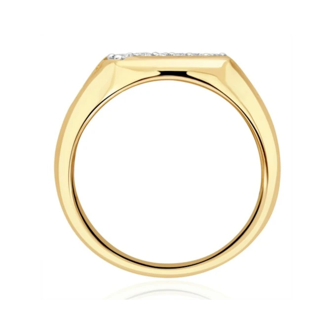 Add elegance to your look with this signet-style diamond ring in luxurious yellow gold. It showcases a diagonal line of dazzling white, sustainable lab grown diamonds, alongside a unique engraved pattern on the shoulders. A stylish ring that looks and feels substantial on the hand.