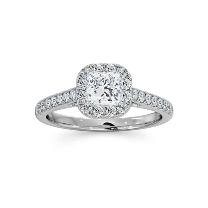 This stunningly sparkling 1.22CT diamond halo ring features an exceptional princess cut solitaire, independently graded as G/SI2 by GIA, the world’s most trusted gem authority. Handcrafted with a dazzling diamond halo and a fine platinum band studded with sidetones, this is a ring she’ll adore for a lifetime.