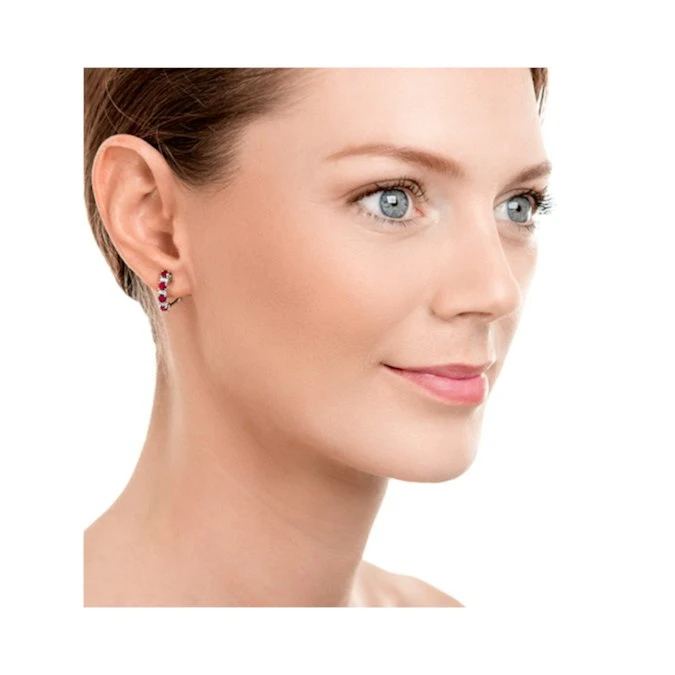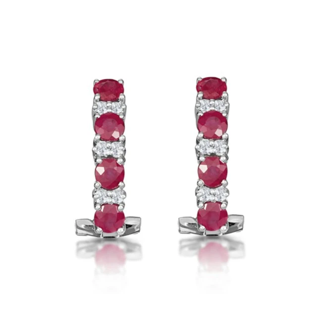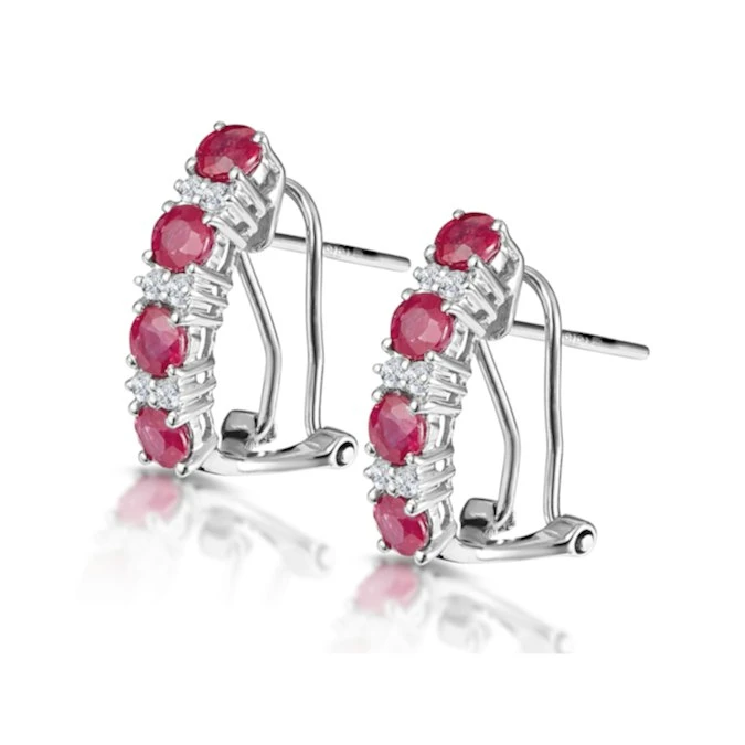 A glamorous pair of Ruby Earrings in 9K White Gold. Claw setting. 0.16CT of Premium Quality diamonds. Gem size is R 1.30CT. Free UK delivery and a 5 year guarantee.