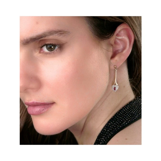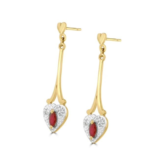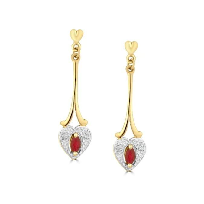 A beautiful pair of Ruby Earrings in 9K Yellow Gold. Claw setting. 0.01CT of Premium Quality diamonds. Gem size is R 5x3mm. Free UK delivery and a 5 year guarantee.