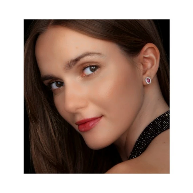 These red ruby earrings look stunning and luxurious. Suitable for an anniversary or birthday gift, ruby is the rare and beautiful birthstone for July. Surrounded by high quality, sustainable lab grown diamonds, these earrings sparkle beautifully in a highly polished sterling silver setting.
