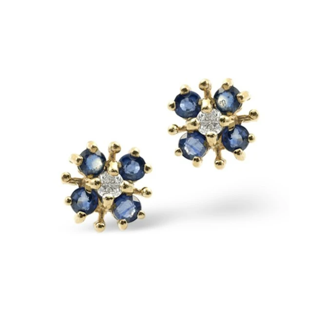 A sweet, eye-catching pair of gemstone earrings with four gorgeous blue sapphires and a sparkling diamond featured on each stud. The intricate floral design is achieved with a handcrafted gold claw setting. An ideal gift or treat for a birthday, anniversary or as a special Christmas present.