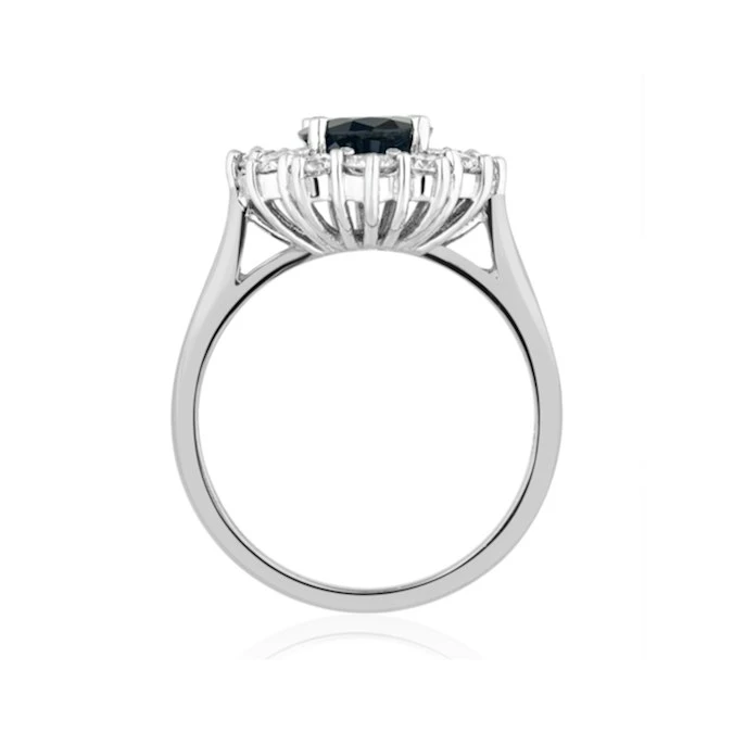 Similar in style to the engagement ring given to the Duchess of Cambridge, this exceptional blue sapphire ring features a staggering 1.00CT of H/SI Quality Diamonds set around the central sapphire stone which measures 9x7mm. The 18K white gold band is the perfect finishing touch to this exquisite engagement ring.