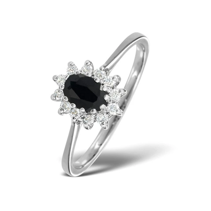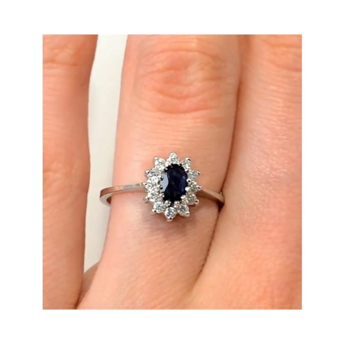 Spoil the one you love by proposing with this attractive engagement ring which features a 6 x 4mm blue sapphire surrounded by 0.18CT of Premium Quality Diamonds. This alluring ring has a white gold band which offsets the diamonds to create a glittering piece of jewellery which is sure to attract compliments.