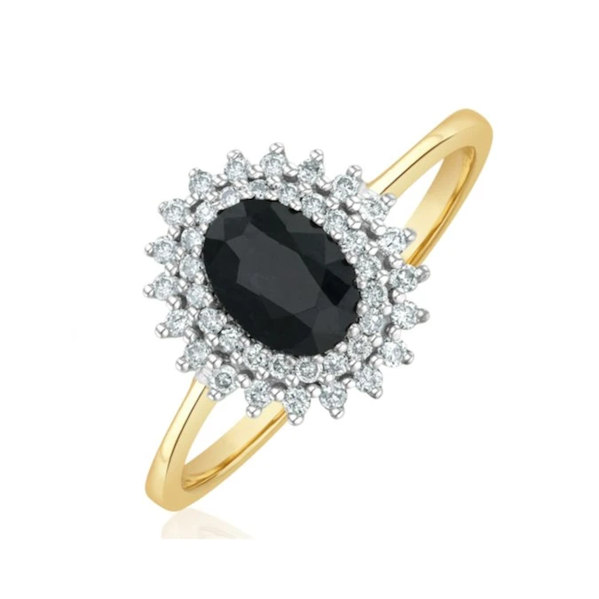 Wow your loved one with this glamorous ring which will add a chic finishing touch to their look. This traditionally designed ring exudes sophistication thanks to the striking central sapphire which measures 7x5mm and is highlighted by a border of clustered diamonds. The Premium Quality Diamonds weigh in at an impressive 0.30CT and the ring is finished with a 9K yellow gold band.