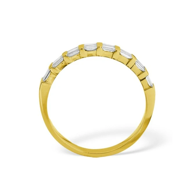 Make a special occasion even more memorable with the beautiful Skye half eternity ring. This ring measures 4.4mm and features a stunning collection of H/SI Quality Diamonds which total 0.50CT and have a contemporary baguette cut design. The glistening diamonds are tension set within an 18K yellow gold band.