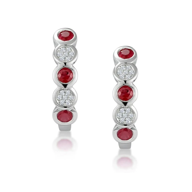 A red ruby symbolises love. These exquisite ruby and diamond earrings are the ideal gift for the special someone in your life. Crafted with white gold, each one is set with three red rubies and two clusters of dainty diamonds for luxurious radiance. A matching ring is also available to complete the set.