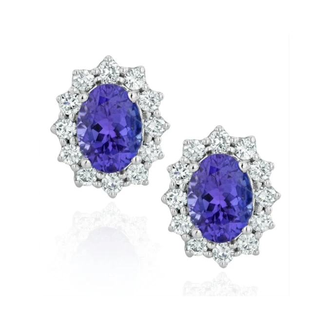These elegant tanzanite earrings shimmer with luxurious blue-violet colour, in contrast with the sparkling, environmentally sustainable lab grown diamonds set around them in a halo. The white gold setting is beautifully polished. A stunning gift that will make a lasting impression.